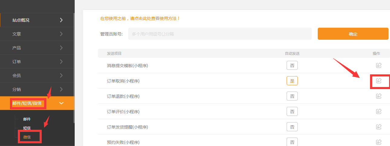 2、在网站后台 邮件/短信/微信-》微信-》中开启对应的模板消息